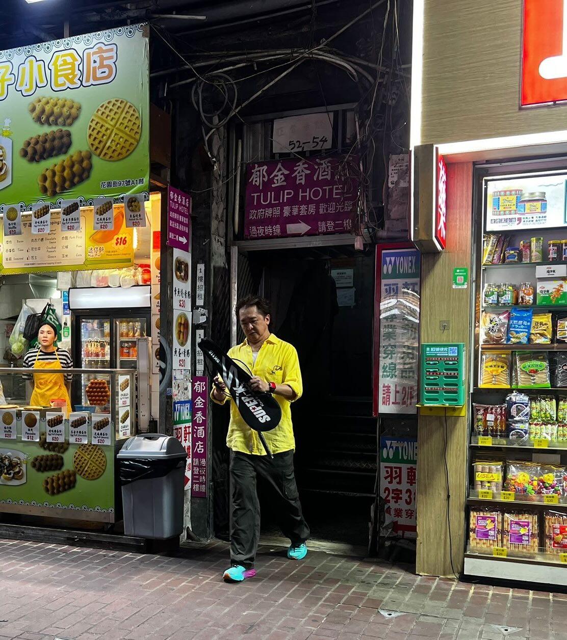 鄧兆尊手拿著羽毛球拍,在建興大廈走出來,在網上掀起熱話。