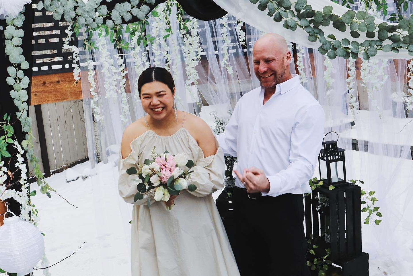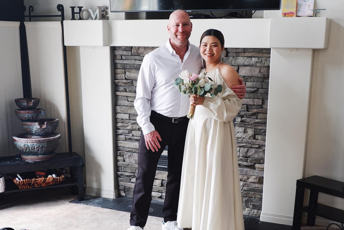 小巧留言說︰「兩種語言,圓滿啦!在這個瘋子橫行的世界,只好跟著自己的步伐走。謝謝參與網上婚禮的香港朋友,因爲時差關係大家都只小睡或根本不睡來參加這亂世下的簡單婚禮。沒有鋪張,自己做一札花,在這好朋友的後花園求婚,在同一地方圓婚,謝謝朋友溫暖的佈置,希望婚後生活也簡單、平淡美好。」