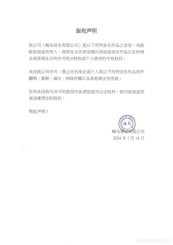 近日,久未更新微博的蜂鳥,忽然發出聲明,詳列103首歌曲,稱「我公司(蜂鳥音樂有限公司)是以下所列音樂作品之錄音、詞曲版權獨家所有人,未經本公司許可,禁止任何單位或個人將以下所列音樂作品用作翻唱、複製、演出、網路傳播以及其他商業性用途」,並強調「任何未經許可的使用均屬侵權,公司可保留追究其法律責任的權利」。不排除與G.E.M.近日舉行巡唱有關。