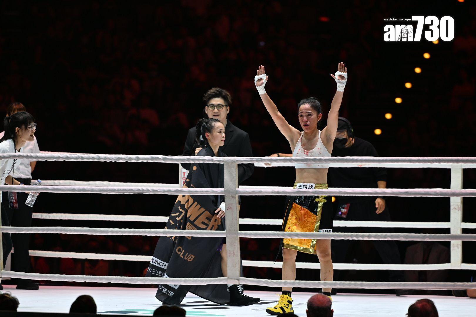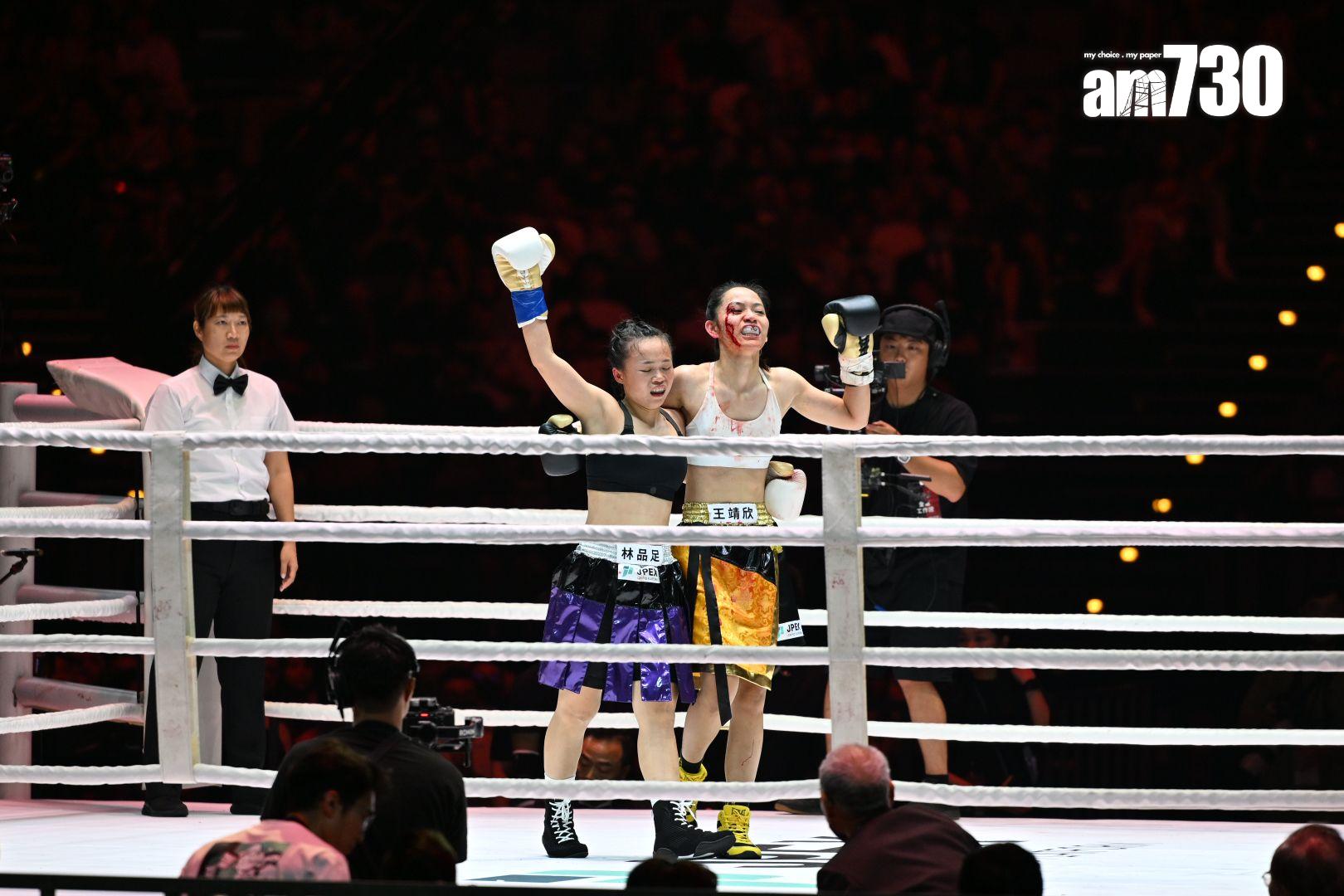 去到第二輪比賽,由職業女拳手王靖欣對戰林品足上陣,這場賽事相當精彩。王靖欣在首回合被林品足打中眉角,令她立即血流如注,現場裁判隨即暫停賽事,並叫在場醫護上擂台為她檢查。王靖欣止血之後再與林品足對打,但在林品足重擊之後,令她的傷勢加劇,搞到成面血,就連拳套及衣服都染成紅色。王靖欣去到第三回合更因體力不繼,多次抱住林品足,最後她以2-1擊敗對方,全場給予掌聲。王靖欣贏得比賽之後,激動落淚,表示自己打拳已快三年,希望可以為台灣爭一分力量。