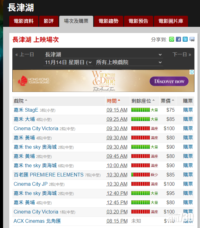 有網民留意到《長津湖》的門票,在多間戲院都賣到滿堂紅,其中以周六下午3時左右的場次,反應最熱烈,位於九展和銅鑼灣的Cinema City,以及奧海城的嘉禾,在差不多時段更連開2至5個影院。另有網民發現,周六下午2時50分於星影匯播出的場次,網上顯示票價為$58,888,估計是包場價錢。