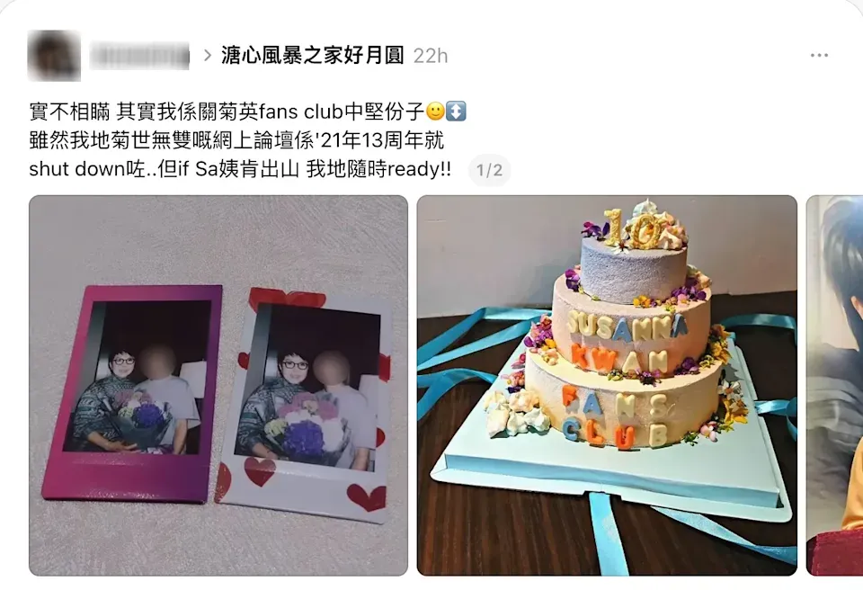 該網民分享多張與關菊英多年前嘅合照,寫道:「實不相瞞,其實我係關菊英fans club中堅份子。雖然我地菊世無雙嘅網上論壇係21年13周年就shut down咗,但if(如果)Sa姨肯出山,我地隨時ready(準備好)!!」