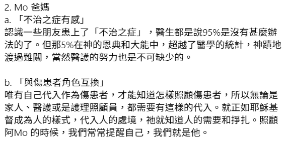 另外,他提到阿Mo因兩週前的發炎、出汗和發抖,所以仍未能拔除尿喉,並透露為防止兒子有防裖瘡而須轉睡姿,令他的睡眠質素欠佳。他又安慰患有不治之症的朋友,稱「醫生都是說95%是沒有甚麼辦法的了。但那5%在神的恩典和大能中,超越了醫學的統計,神蹟地渡過難關,當然醫護的努力也是不可缺少的。」亦同時分享作為照顧者的感受,「照顧阿Mo 的時候,我們常常提醒自己,我們就是他。」