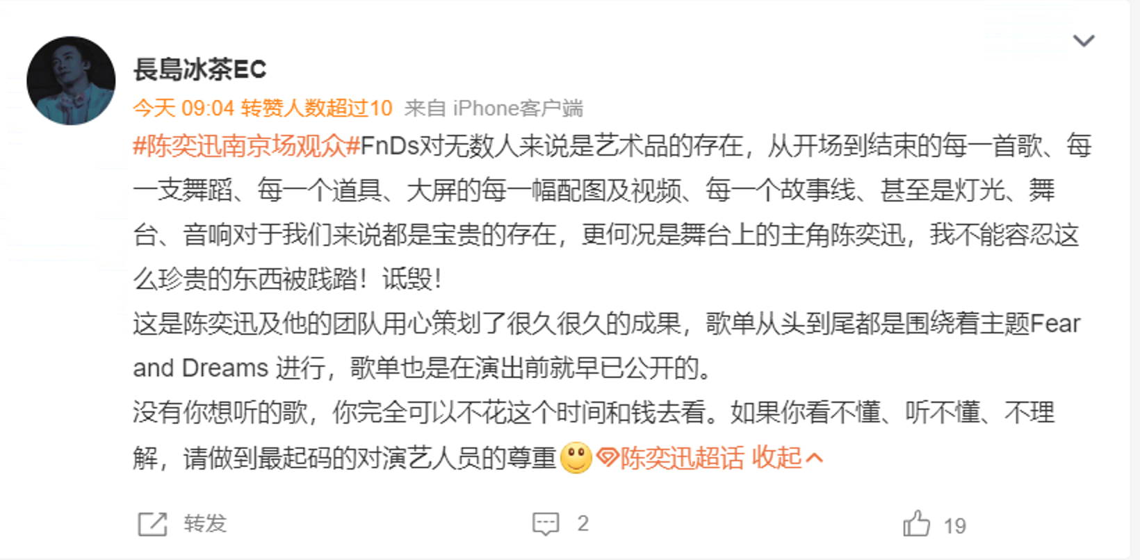 陳奕迅(Eason)近日到南京舉行巡迴演唱會,有指會場內有觀眾在他演唱時大舉中指,甚至要求他唱《富士山下》,令他在演繹《任我行》時,只好背住觀眾調整情緒。事件在微博火速傳開,不少人心痛Eason的演出被沒有質素的觀眾打斷。