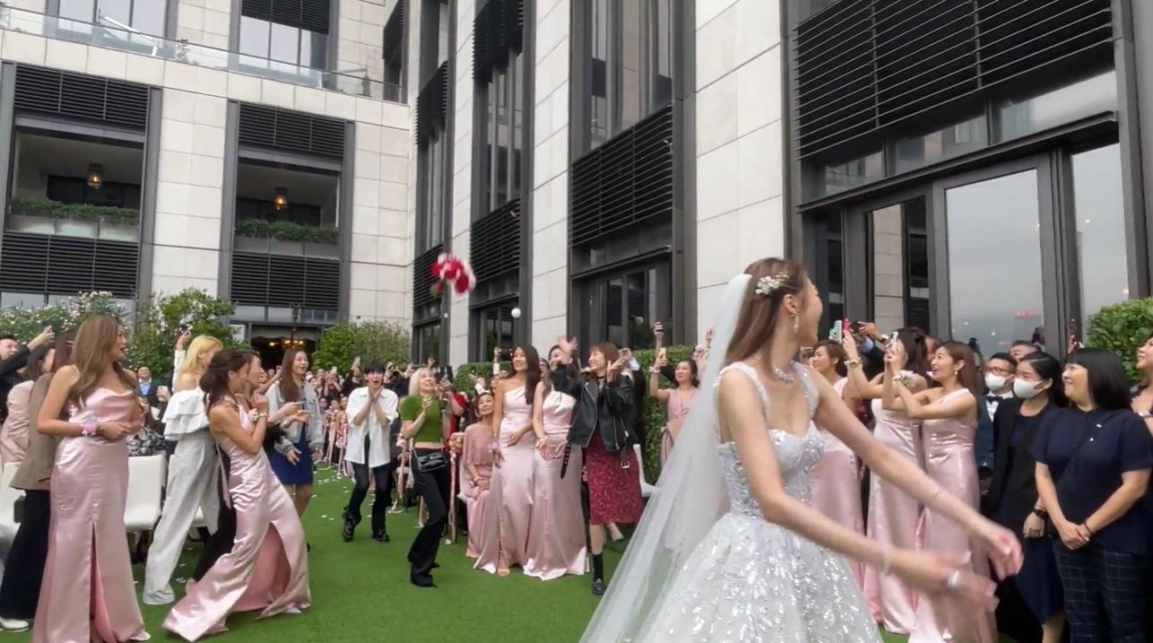 接到花球的泳兒笑言,自己是「避無可避」︰「個花球係拋物線咁向住我塊面掉過嚟。」她表示很開心,是很大的祝福。路過的張敬軒上前搭訕謂︰「我嚟接花球,點知被Vincy姐先拔頭籌。原本嚟恭喜家樂同Shiga,依家要恭喜佢先。」他更指今次是上天要泳兒早日拉埋天窗,並揚言若對方結婚,他會擔任大妗姐及婚禮策劃師,還會送上大利是。