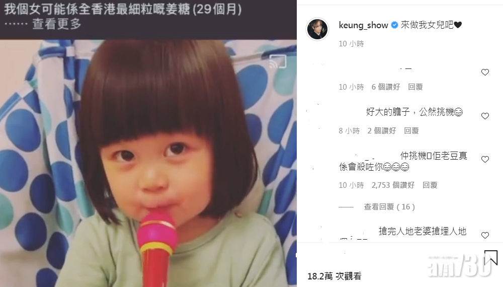 「我老婆嫁咗MIRROR導致婚姻破裂關注組」成為城中熱話,姜濤與柳應廷(Jer)日前出席公開活動時,雙雙向群組的苦主致歉。昨晚(6日)姜濤卻在社交平台公然向人家的老公/爸爸挑機,他轉載一段約兩歲半(29個月)小女孩唱《蒙著嘴說愛你》的片段,寫著:「來做我女兒吧!」
