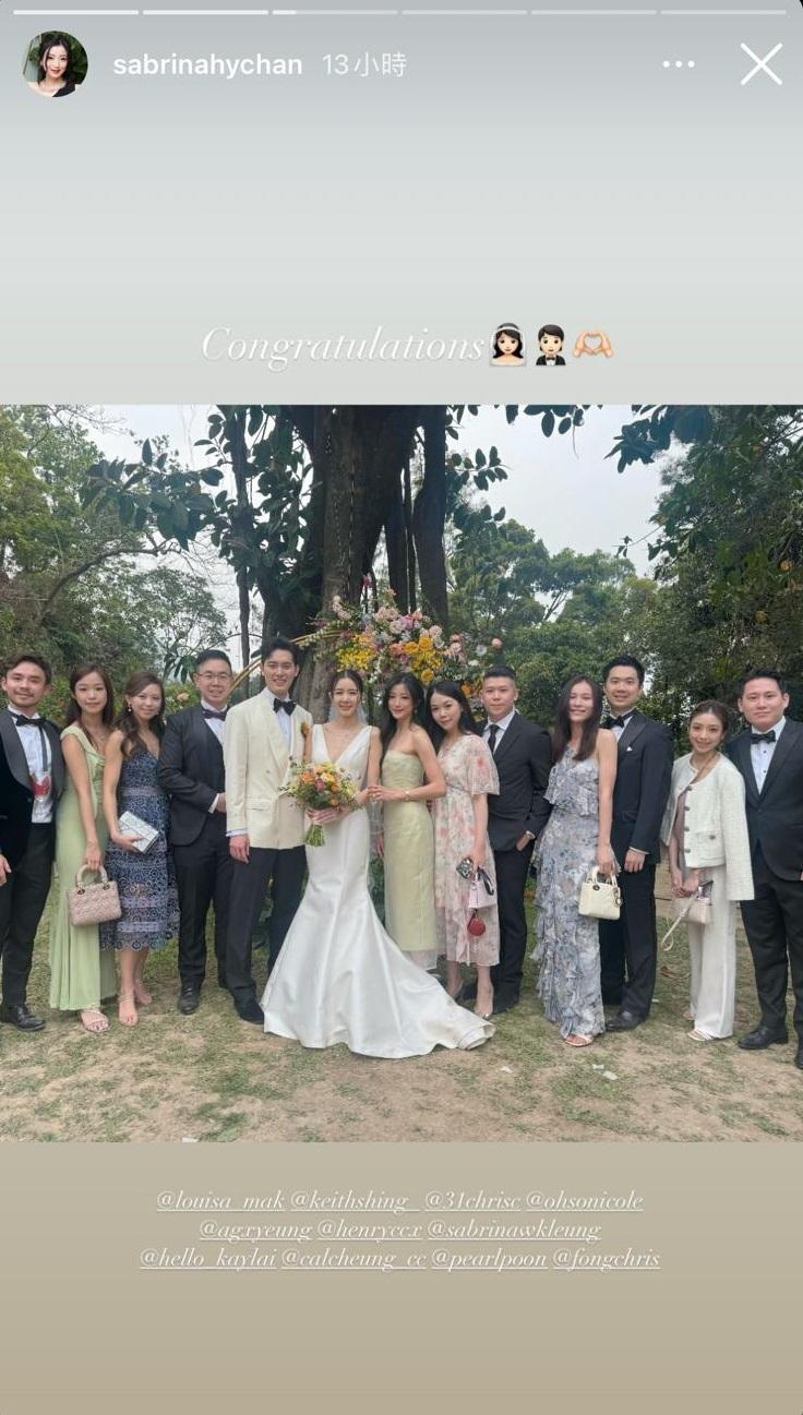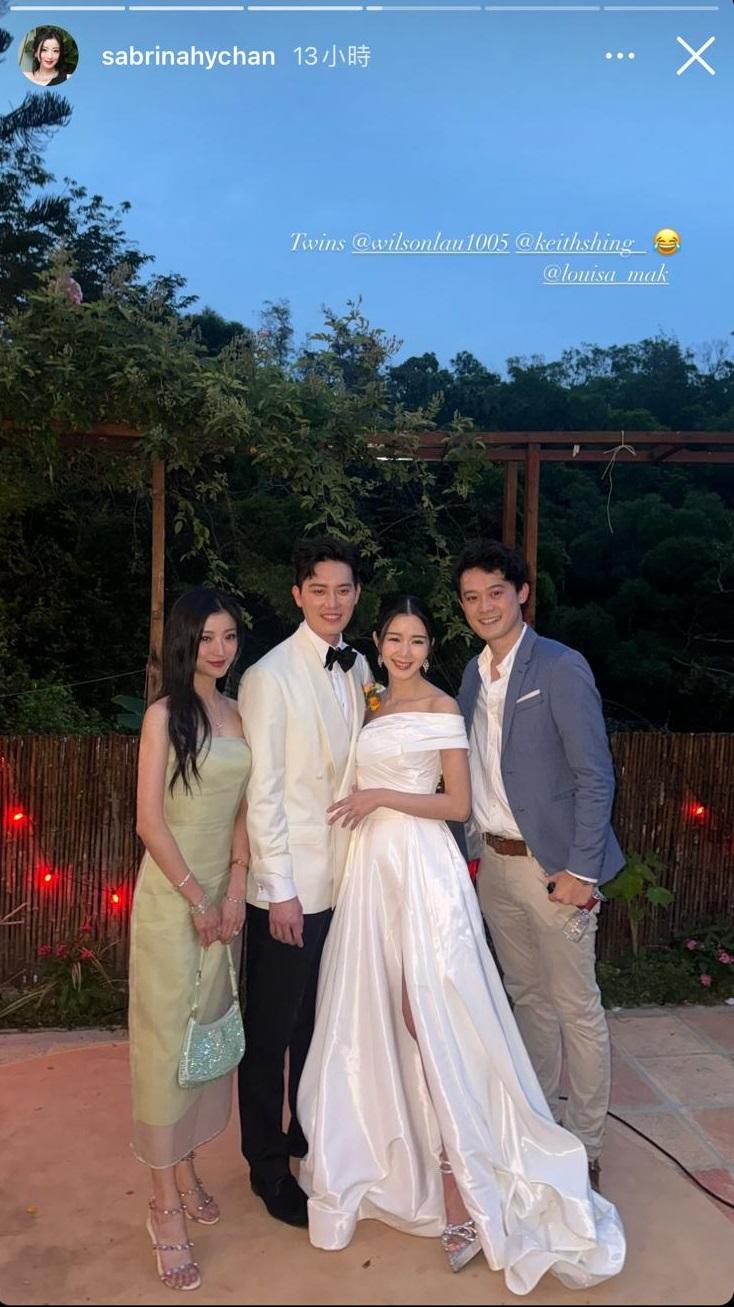 其後換上一字膊婚紗上陣,露出白滑香肩及迷人鎖骨,高貴優雅,而盛勁為則化身白馬王子,以一套白色西裝示人,與新娘子襯到絕。