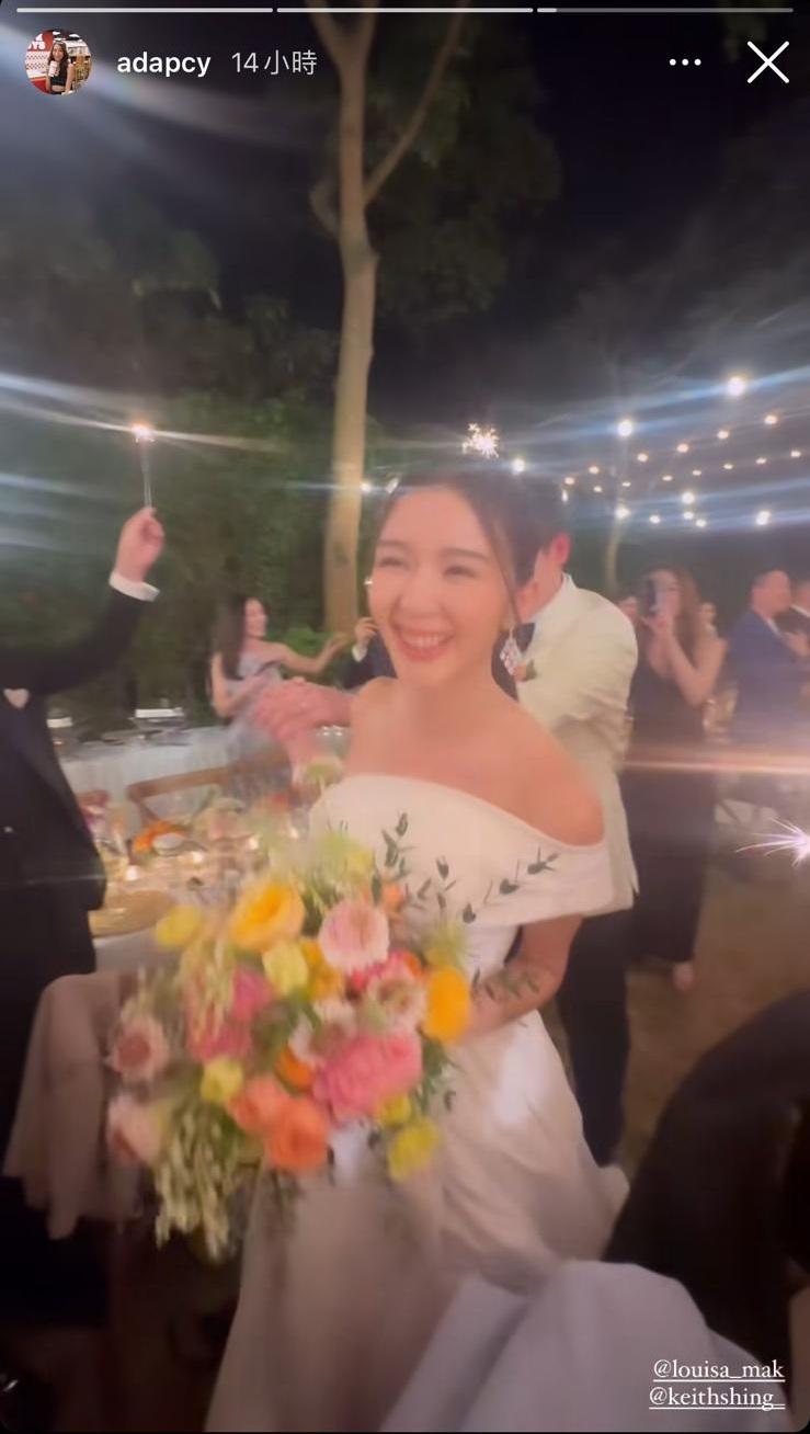 婚禮以自助餐形式舉行,麥明詩全程拖實老公滿場飛,現場除準備了三層大蛋糕,見賓客們手上還持有一支支花火,場面浪漫。有在場的賓客更拍下麥明詩與盛勁為在場地一旁錫咀,朋友更謂︰「使唔使咁sweet!」