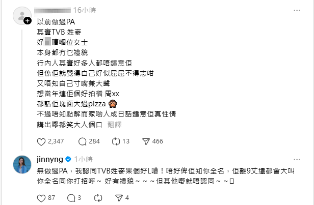 另有不少人表示做過PA,曾跟麥美恩合作,全都指她非常有禮貌,而且工作認真又專業。亦有網民搞笑問道樓主指「TVB 姓麥好X嘈嗰位女士」是否在說麥玲玲。