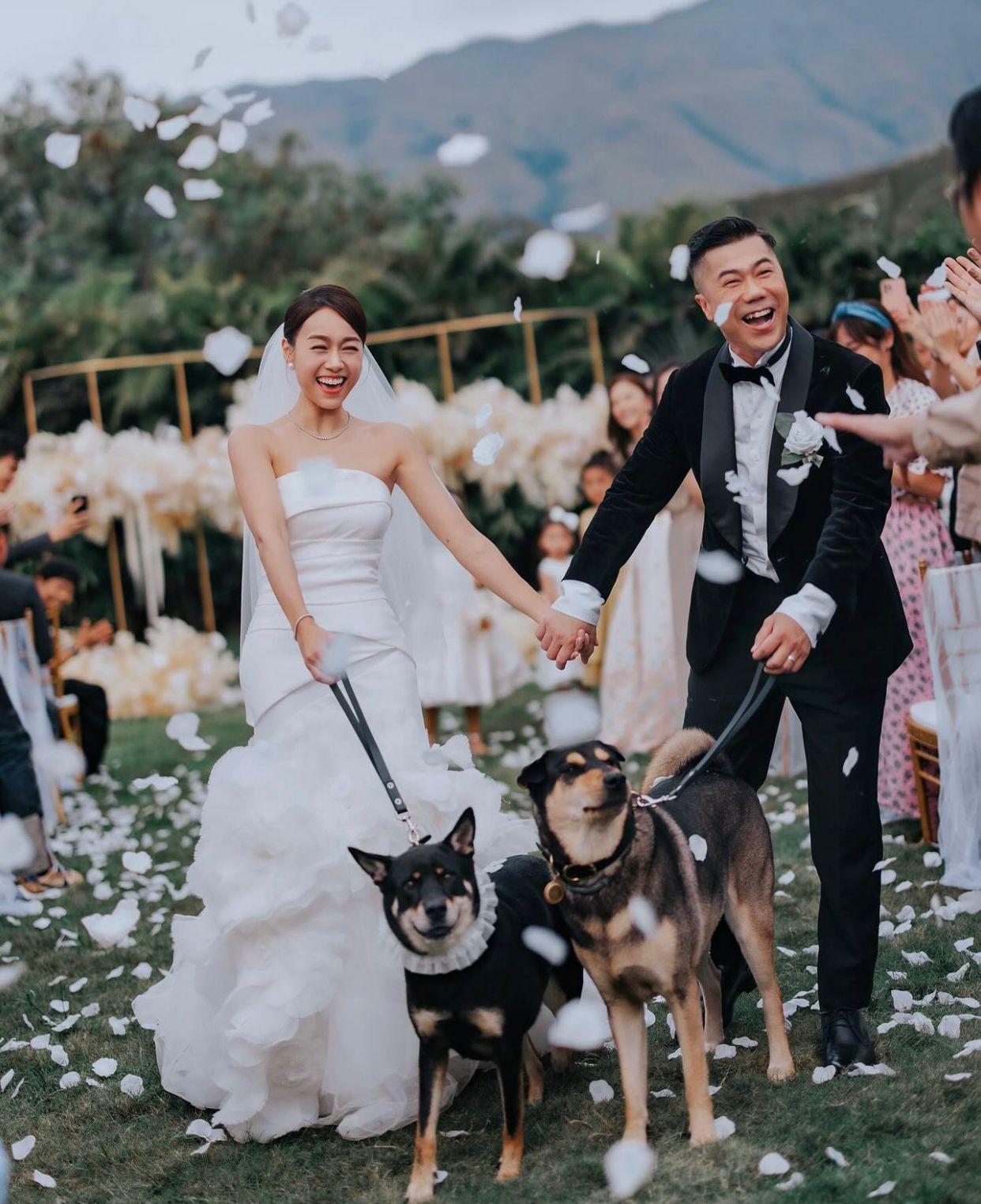 一對新人拖住狗狗獲在場人士祝福,笑到見牙唔見眼。