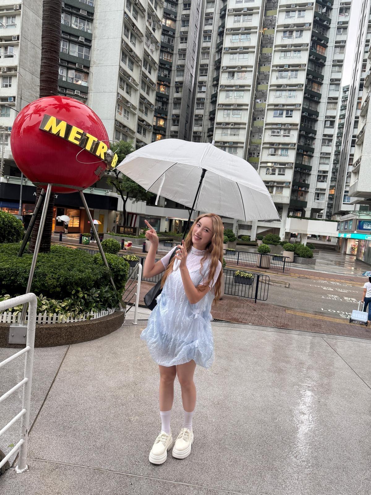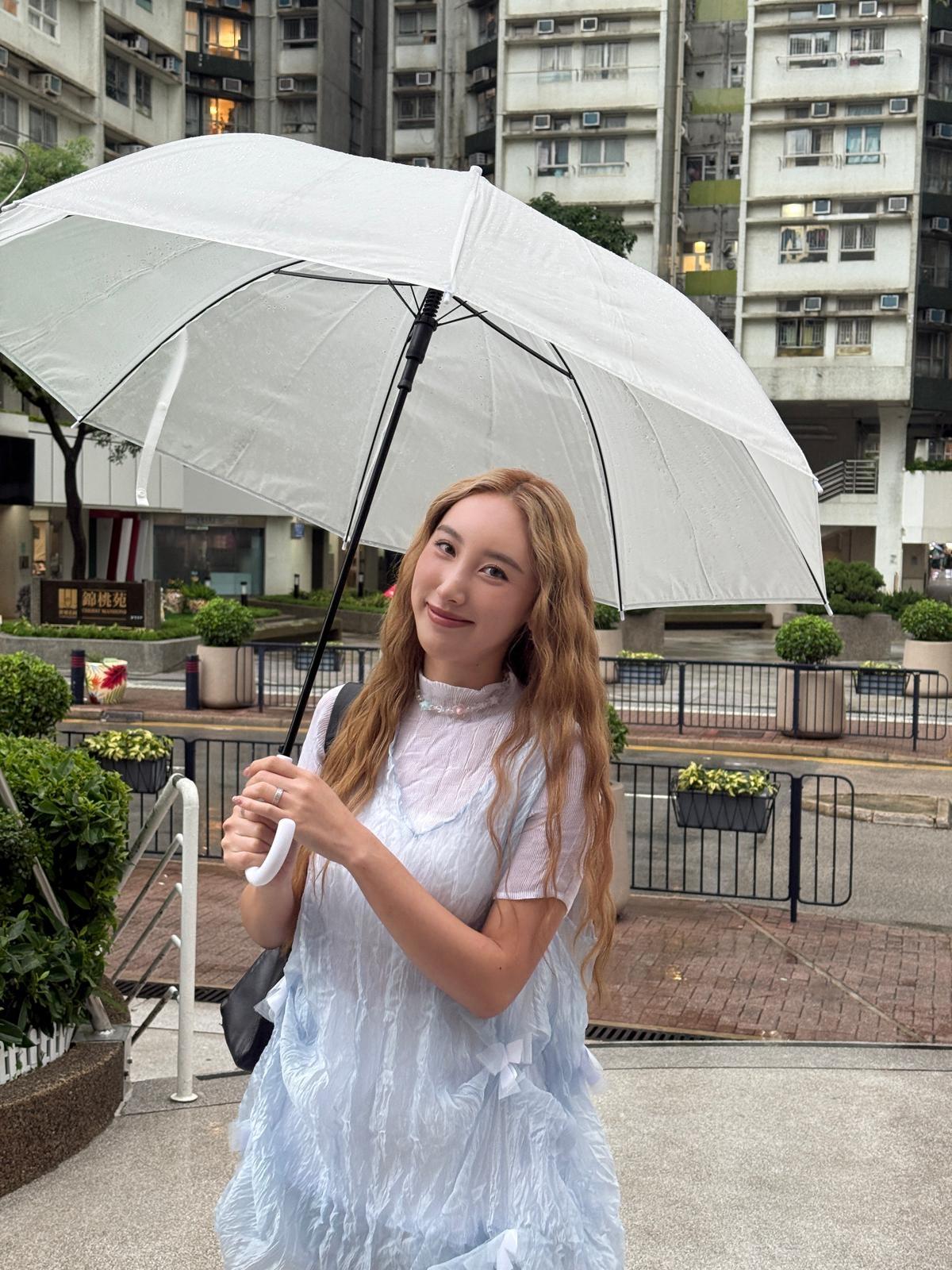 Angela則表示今天早上8時起床後,知道「黑雨」,一度很擔心能否如期到新城做訪問,她細心說:「知道兩位主持及錄音室時間好緊密,唔想打亂佢哋時間表,所以第一時間主動通知自己可以如期錄音。(主持程凱欣讚打扮仙氣?) 見落雨,天色好暗又悶熱,特登揀陽光粉藍色,開心吓囉!雨中帶點陽光。」