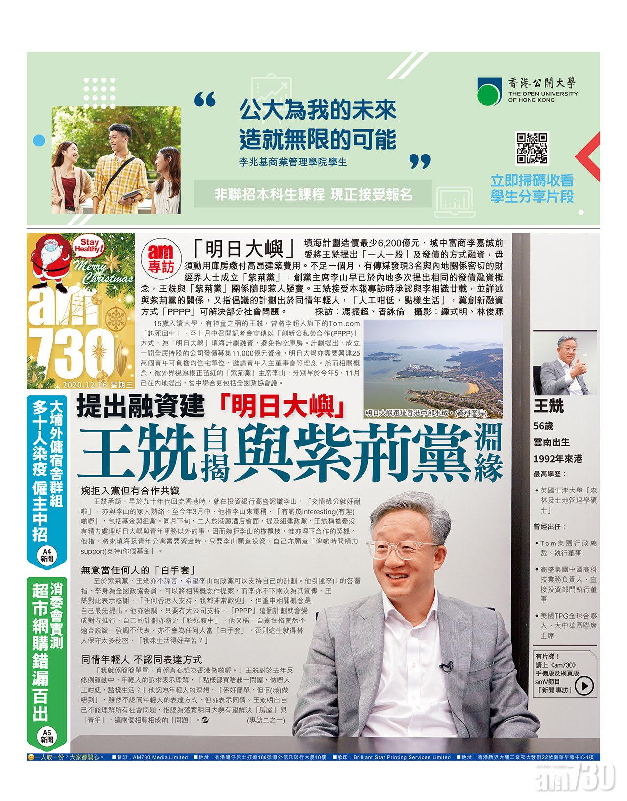 「明日大嶼」填海計劃造價最少6,200億元,城中富商李嘉誠前愛將王兟提出「一人一股」及發債的方式融資,毋須動用庫房繳付高昂建築費用。不足一個月,有傳媒發現3名與內地關係密切的財經界人士成立「紫荊黨」,創黨主席李山早已於內地多次提出相同的發債融資概念,王兟與「紫荊黨」關係隨即惹人疑竇。王兟接受本報專訪時承認與李相識廿載,並詳述與紫荊黨的關係,又指倡議的計劃出於同情年輕人,「人工咁低,點樣生活」,冀創新融資方式「PPPP」可解決部分社會問題。