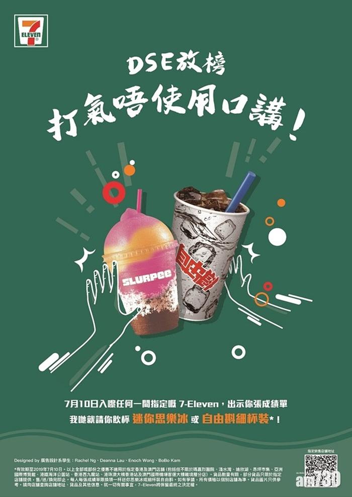 DSE考生只需於放榜當日,到有售賣思樂冰或自由斟的指定7-Eleven店舖,出示2019年香港中學文憑考試成績通知單,即可免費獲贈迷你思樂冰或細杯自由斟一杯,每人每張成績單限換一杯迷你思樂冰或細杯裝自由斟,送完即止。優惠有效期從2019年7月10日早上7時至晚上11時59分。