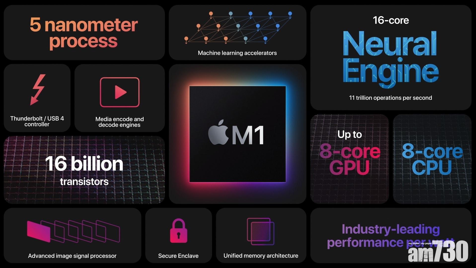 Apple自家電腦處理器(Apple Silicon)正式登場,發布會更以已故「教主」喬布斯經典口號「One more thing」作主題,吸引不少目光。Apple Silicon第一代處理器名為「M1」,採用5nm制程,8核心,並一口氣放於13吋Macbook Air、Mac Mini及13吋Macbook Pro3個型號中使用,售價分別7,799港元起、5,499港元起及9,999港元起(均由256GB SSD硬碟容量起跳)。今日起接受預訂,下周推出。