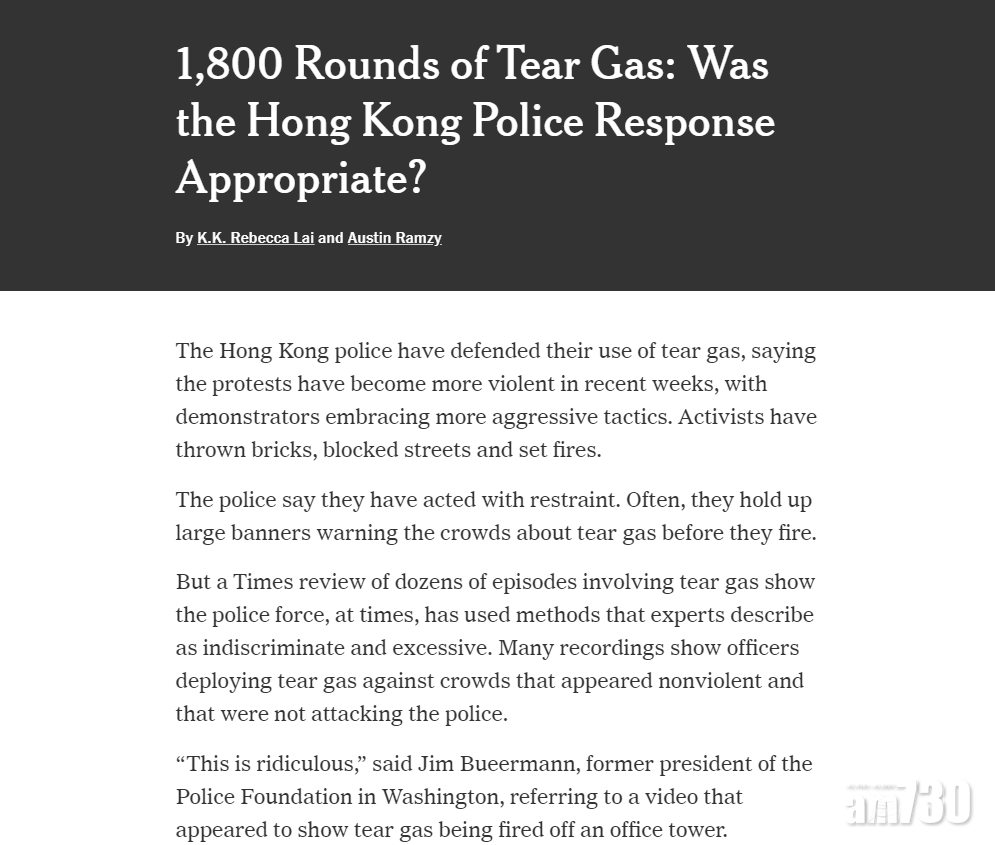 至於無差別使用催淚彈,《紐時》以8月6日深水埗警署被圍堵一事為例子,指警方在遠處或半隱閉處,向民眾發射催淚彈的策略,被指為「不恰當」(inappropriate), 原因是群眾事前沒有接收到充分警告(the crowds don’t have sufficient warning)、警員亦未必能完全掌握環境(the police don’t have a full view of the environment)。