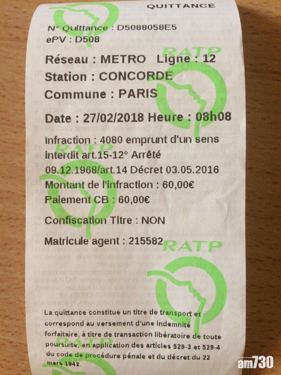 本港地鐵站的樓梯及通道,常貼有標示方向的箭咀,不知大家有否跟循?法國巴黎一名孕婦便因在行人路「逆線」行走被罰款。該名女事主上月在羅浮宮附近的協和廣場站(Concorde)乘地鐵,因想節省時間,在只可單向出入的行人通道反方向行,結果被罰60歐元(約580港元),男友在網上公開罰單說「這種詐騙太強了」,批評地鐵無盡力打擊逃票乘客及小偷,只顧處罰逆行乘客。不少網民說當日自己亦有被罰,一名女士透露她原以為通道指示是避免乘客走錯路,稱當時通道僅得自己一人,但仍收到告票。地鐵公司解釋指限制乘客在通道單一方向行走,目的是保持通道暢通,避免發生意外,情況如駕駛人士逆線行車,亦需被罰。