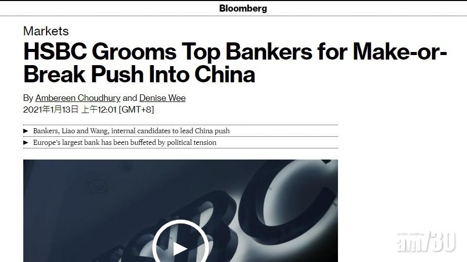 《彭博社》報道,滙豐正遴選王冬勝接班人,廖宜建王雲峰呼聲高。(彭博社網站截圖)