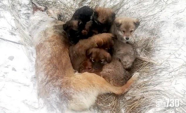 狗媽媽大半身體被冰封,7隻狗BB偎在其未結冰懷裡。(互聯網)
