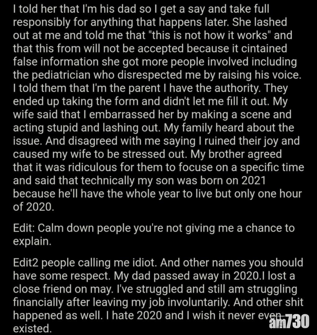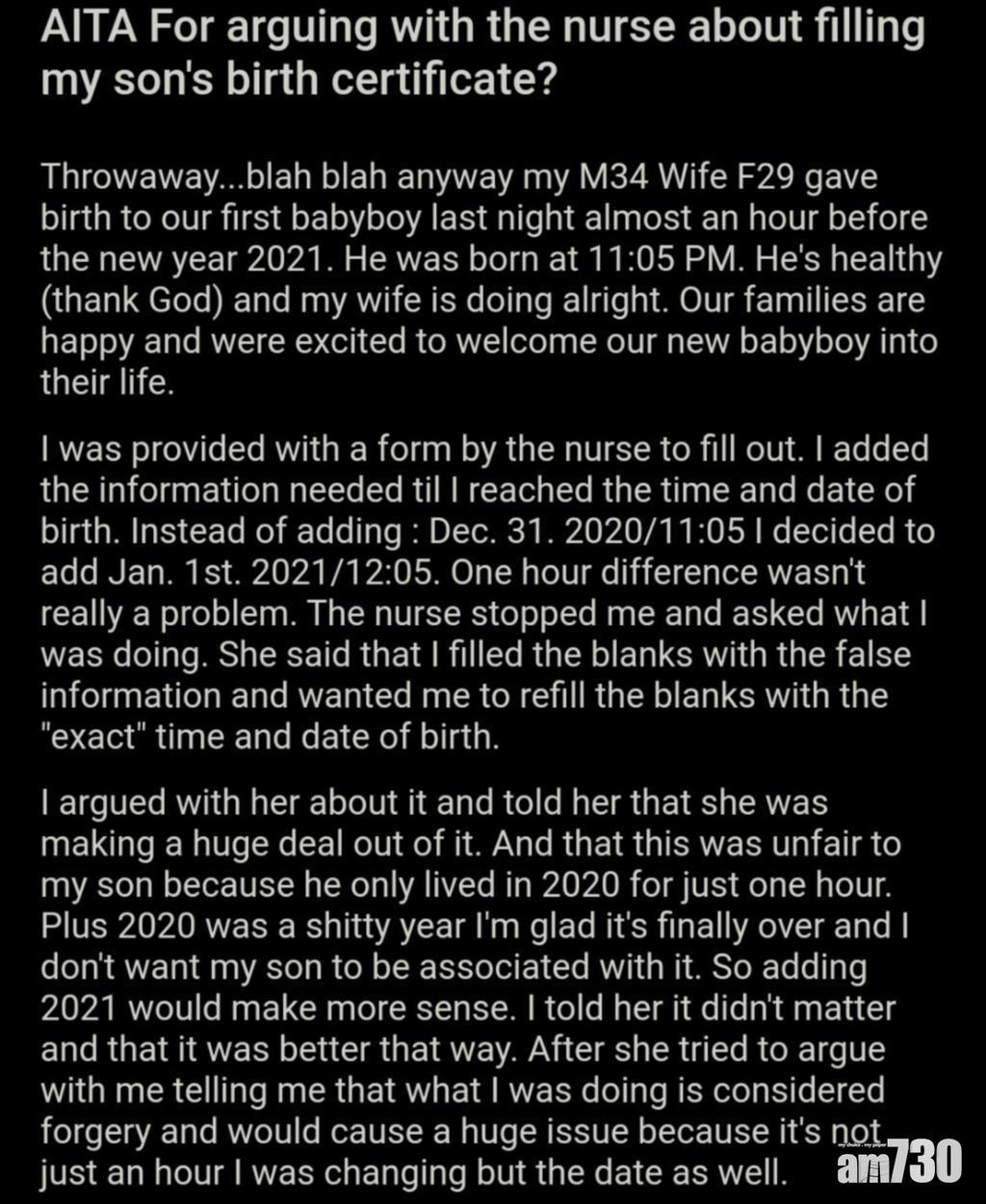 一名34歲的男子早前在美國討論區Reddit的AITA(我是混蛋嗎?)中發貼,指他的兒子於2020年12月31日晚上11時05出生,當他拿到出生證明表格填寫詳細信息時,因為討厭2020年,所以打算捏造孩子的出世時間,把孩子的出世時間擅自推遲一小時。
