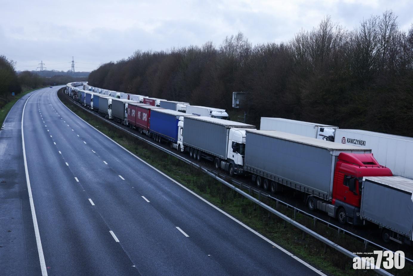 貨車在通往多佛爾港的M20公路大排長龍。(路透社)