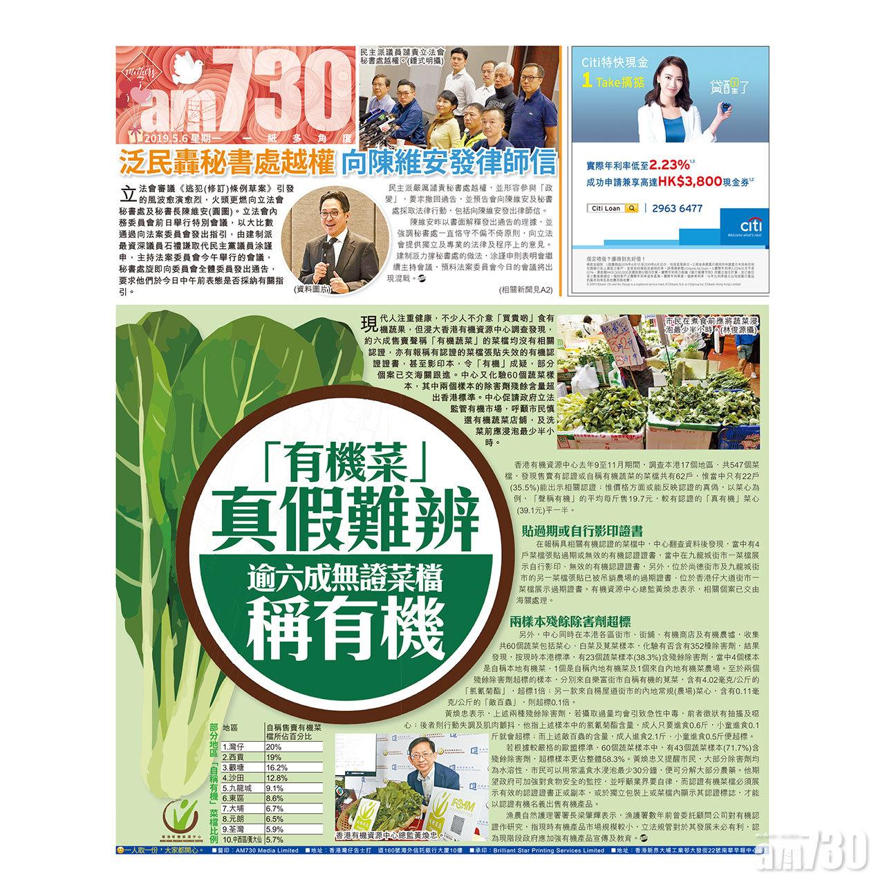 現代人注重健康,不少人不介意「買貴啲」食有機蔬果,但浸大香港有機資源中心調查發現,約六成售賣聲稱「有機蔬菜」的菜檔均沒有相關認證,亦有報稱有認證的菜檔張貼失效的有機認證證書,甚至影印本,令「有機」成疑,部分個案已交海關跟進。中心又化驗60個蔬菜樣本,其中兩個樣本的除害劑殘餘含量超出香港標準。中心促請政府立法監管有機市場,呼籲市民慎選有機蔬菜店舖,及洗菜前應浸泡最少半小時。