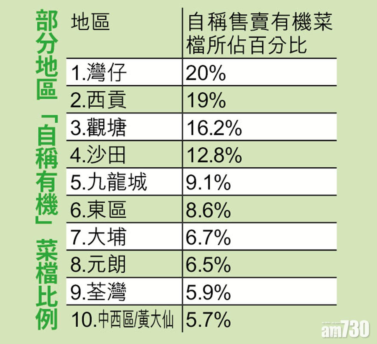 香港有機資源中心去年9至11月期間,調查本港17個地區、共547個菜檔,發現售賣有認證或自稱有機蔬菜的菜檔共有62戶,惟當中只有22戶(35.5%)能出示相關認證;惟價格方面或能反映認證的真偽,以菜心為例,「聲稱有機」的平均每斤售19.7元,較有認證的「真有機」菜心(39.1元)平一半。
