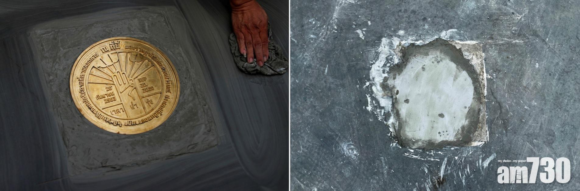 泰國反政府示威者一連兩日於曼谷大皇宮附近集會示威,要求重新選舉並改革王室,他們周日在皇家田廣場的地上,鑲嵌「國家屬於人民,不是屬於皇室」的牌匾,但不足一日已被移除,位置填上水泥。