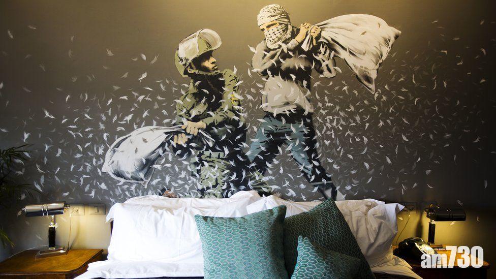 酒店房間以Banksy諷刺以巴衝突的作品作裝飾。