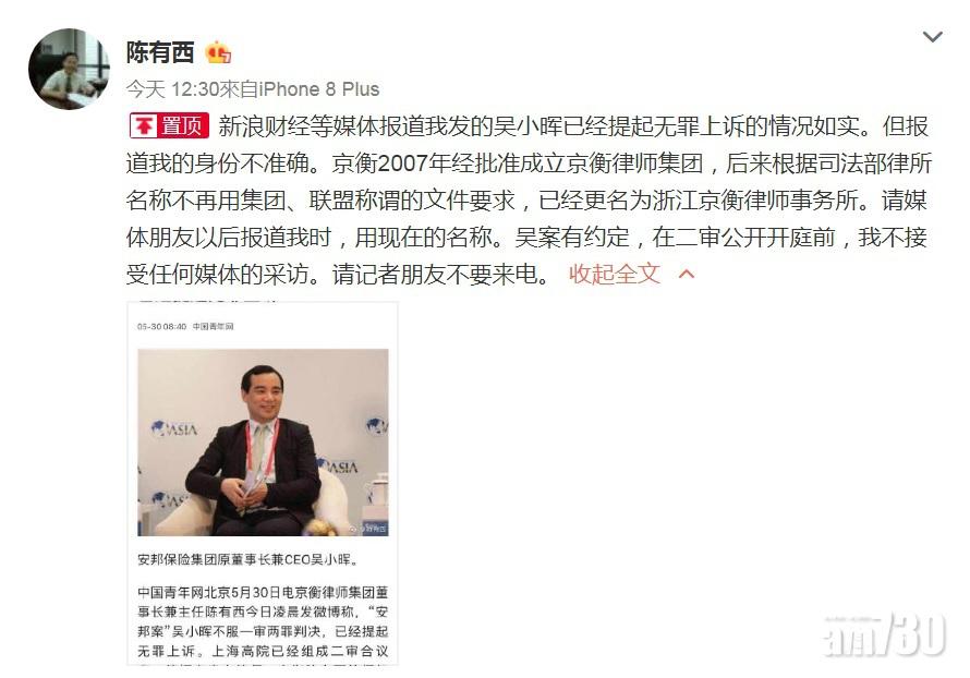 中共已故領導人鄧小平的外孫女前夫、安邦集團前董事長吳小暉,被控集資詐騙及職務侵佔共752億元人民幣,案件3月28日一審時,吳表示認罪求輕判,至本月10日被判囚18年,惟當時吳未表態是否上訴。事隔近3周後,浙江杭州律師陳有西今日清晨在微博表示,吳小暉不服一審判決,已經提出「無罪」上訴,上海高院亦已組成二審合議庭,他與李貴方律師同時擔任吳小暉案二審辯護律師。