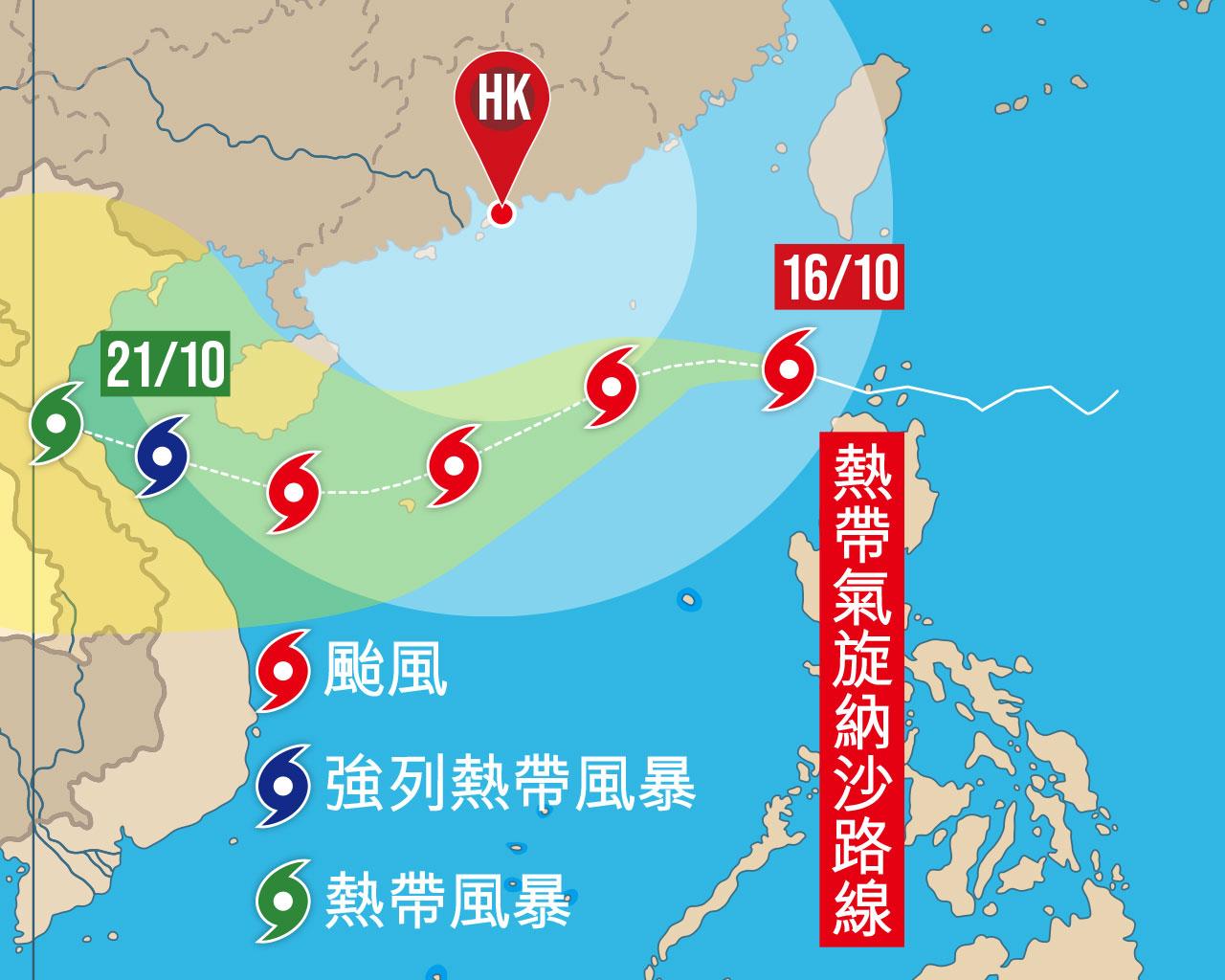 「秋颱」再現,天文台於昨晚9時20分發出一號戒備訊號,視乎風力變化考慮改發三號風球,澳門更於昨午2時已發出一號風球。熱帶氣旋納沙昨早進入南海東北部,而一股東北季候風補充抵達華南;兩者共同影響下,香港本周初至中期廣東沿岸風勢頗大,有幾陣驟雨,預計市區氣溫由今午最高攝氏29度,跌至明日傍晚(18日)只有19度,新界再低幾度,後日(19日)清晨打鼓嶺最低僅約15度。天文台指隨納沙遠離廣東,本周後期沿岸地區天色好轉。