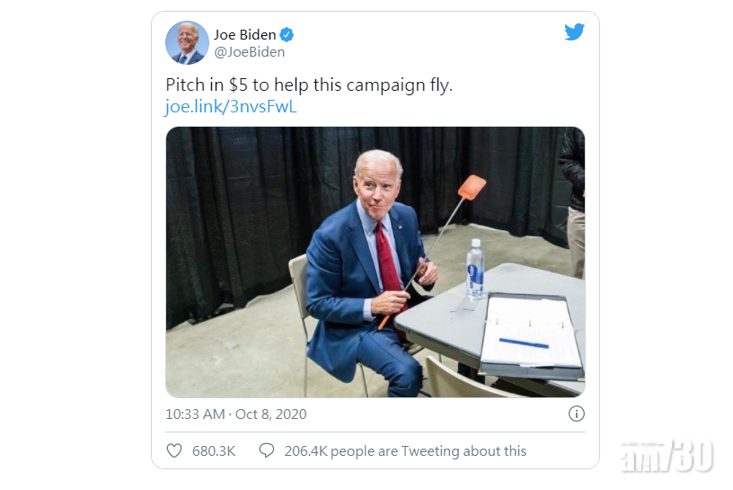 拜登陣營隨即「抽水」,在網上開玩笑稱賣烏蠅拍籌款。(互聯網)