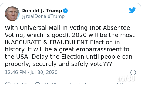 美國總統特朗普周四在Twitter發出震撼貼文,提議押後原定11月3日舉行的2020年大選,「直至民眾能恰當、妥善及安全地投票」(delay the election until people can properly, securely and safely vote)。他質疑,如果今屆大選「全民郵遞投票」(universal mail-in voting),將會「成為史上最不準確及造假的選舉」(most inaccurate and fraudulent election in history),屆時會「令美國極為尷尬」(great embarrassment to the USA)。受新冠肺炎疫情影響,本月較早前有最少6個州份計劃今年改為郵遞投票,包括加州、猶他、夏威夷、科羅拉多、俄勒岡及華盛頓州。