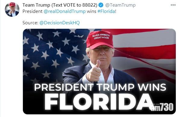 特朗普陣營宣聲稱取下佛羅里達州。(Twitter)
