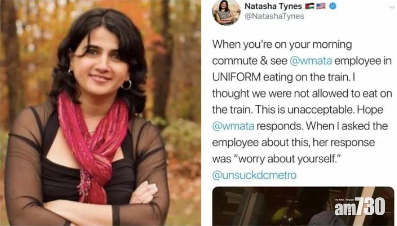 美國馬里蘭州女作家泰納斯(Natasha Tynes),上月在華盛頓偷拍一名鐵路公司黑人女職員在列車上吃早餐,於Twitter貼相並留言投訴:「早上乘列車,在車上見到一名穿著制服的職員吃東西,我認為是不准在列車上進食的。不可接受。希望有回應。」泰納斯其後應鐵路公司要求,提供事發時間及列車行駛方向等資料。