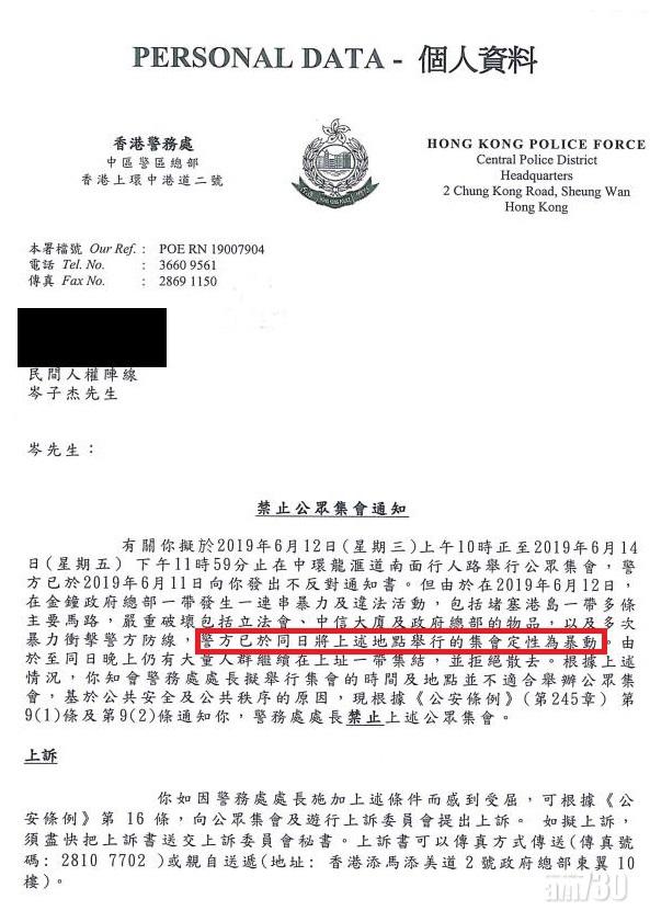 民陣將於本月21日晚在金鐘添美道集會,重申要求政府撤回修訂《逃犯條例》及成立獨立調查委員會等5大訴求。民陣召集人岑子杰表示,警方在上月12日金鐘衝突發生後,就之後的遊行活動,向民陣發出的一封「反對通知書」,白紙黑字說明警方曾經定性金鐘政府總部一帶集會為「暴動」,質疑林鄭月娥指從無為衝突定性的說法是說謊。