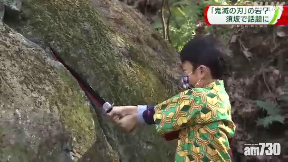 有父母帶著cosplay《鬼滅之刃》主角群的小朋友們到現場朝聖,更紛紛重演炭治郎用劍砍石頭的畫面,拍照留念。1名小學3年級的男童笑稱,這塊岩石真的很大,劈下去的感覺非常好,那一刻彷彿是炭治郎上身。