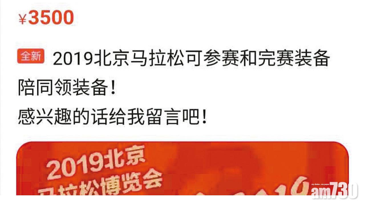 下月3日在北京天安門廣場起跑的「2019華夏幸福北京馬拉松」(下稱「北馬」),有逾16萬人爭3萬個參賽名額,抽籤結果月初公布後,阿里巴巴旗下二手平台「閒魚」,以及微信群組等平台,都有不少人以數百元(人民幣,下同)至3,500元求購或「割愛」出售名額(圖)。北馬組委會周五發聲明,強調私下轉讓馬拉松參賽名額屬違法,會聯同警方調查,由警方等部門作出嚴厲懲罰。