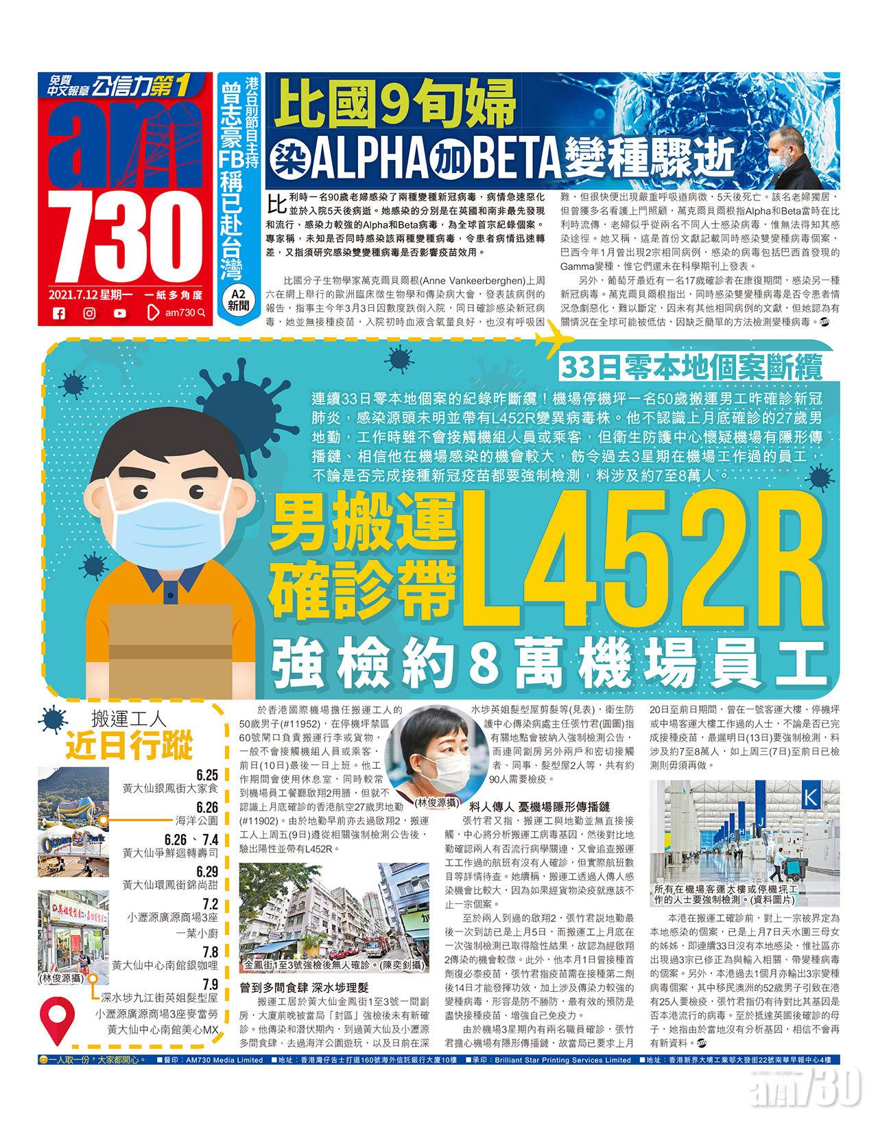 連續33日零本地個案的紀錄昨斷纜!機場停機坪一名50歲搬運男工昨確診新冠肺炎,感染源頭未明並帶有L452R變異病毒株。他不認識上月底確診的27歲男地勤,工作時雖不會接觸機組人員或乘客,但衛生防護中心懷疑機場有隱形傳播鏈、相信他在機場感染的機會較大,飭令過去3星期在機場工作過的員工,不論是否完成接種新冠疫苗都要強制檢測,料涉及約7至8萬人。
