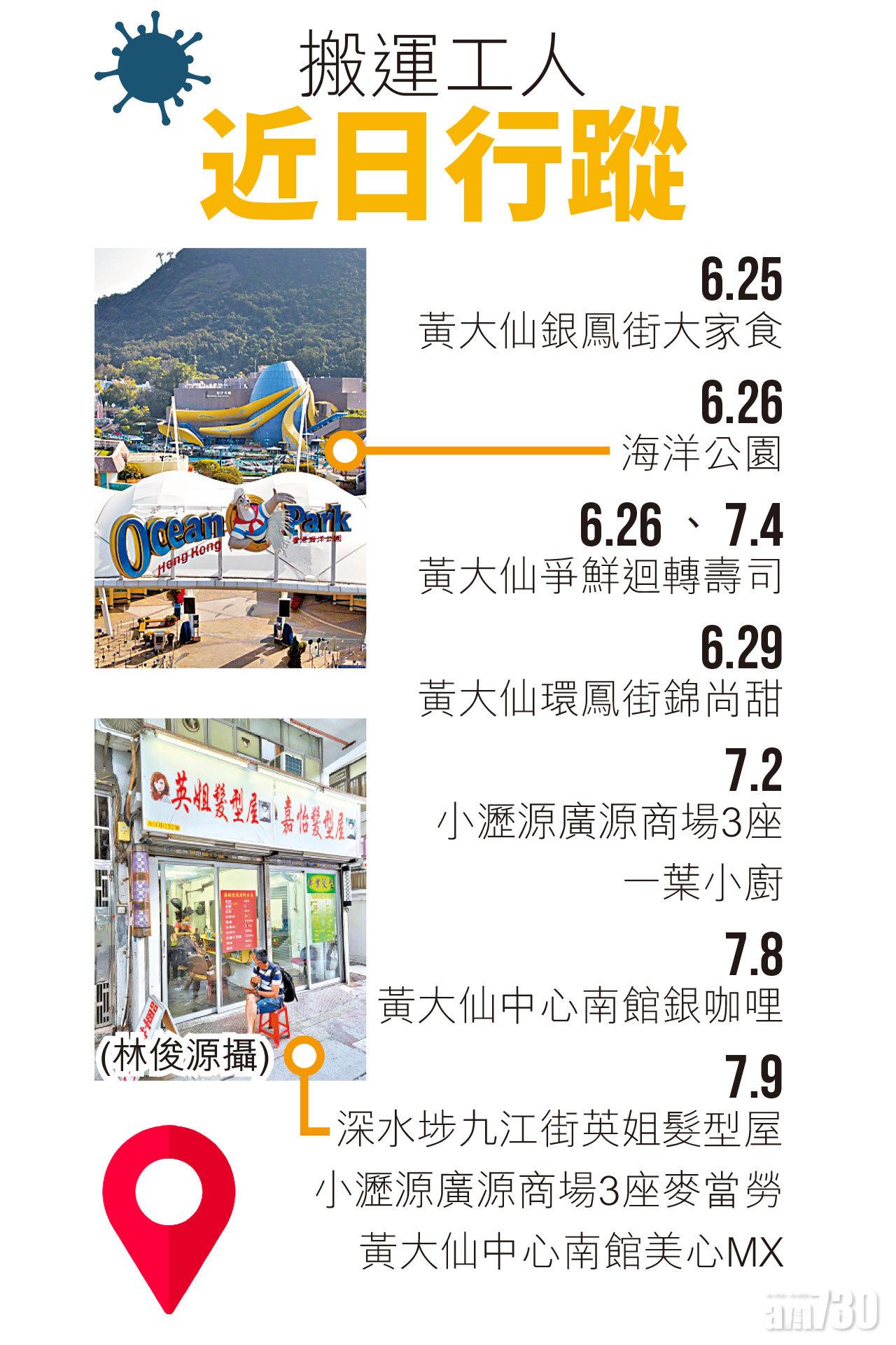 搬運工居於黃大仙金鳳街1至3號一間劏房,大廈前晚被當局「封區」強檢後未有新確診。他傳染和潛伏期內,到過黃大仙及小瀝源多間食肆、去過海洋公園遊玩,以及日前在深水埗英姐髮型屋剪髮等(見表),衛生防護中心傳染病處主任張竹君(圓圖)指有關地點會被納入強制檢測公告,而連同劏房另外兩戶和密切接觸者、同事、髮型屋2人等,共有約90人需要檢疫。