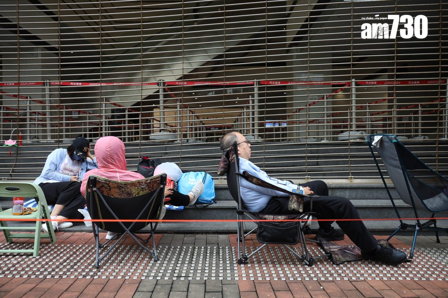 法院大樓外有警方裝甲車「劍齒虎」,行人路旁設置了鐵欄,亦有大批備用的鐵馬。法庭外早有大批人士排隊,隊頭十多人大多都戴上口罩,記者向他們問及排隊原因及旁聽的案件,他們都無回應。社運人士「女長毛」雷玉蓮昨早到場排隊,排第14位。她指由網上得悉有人排隊,所以連忙趕來,又質疑排隊頭的是排隊黨。