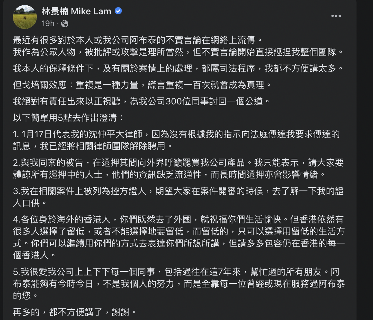 林景楠昨在社交平台發文,其他同案的被告在還押期間,向外界呼籲罷買其公司的產品,他呼籲大眾體諒所有還押者,認為他們只是「資訊缺乏流通性」,而長時間還押亦會影響情緒。他亦承認已被列為控方證人,期望大眾在案件開審時能了解他的證人口供。