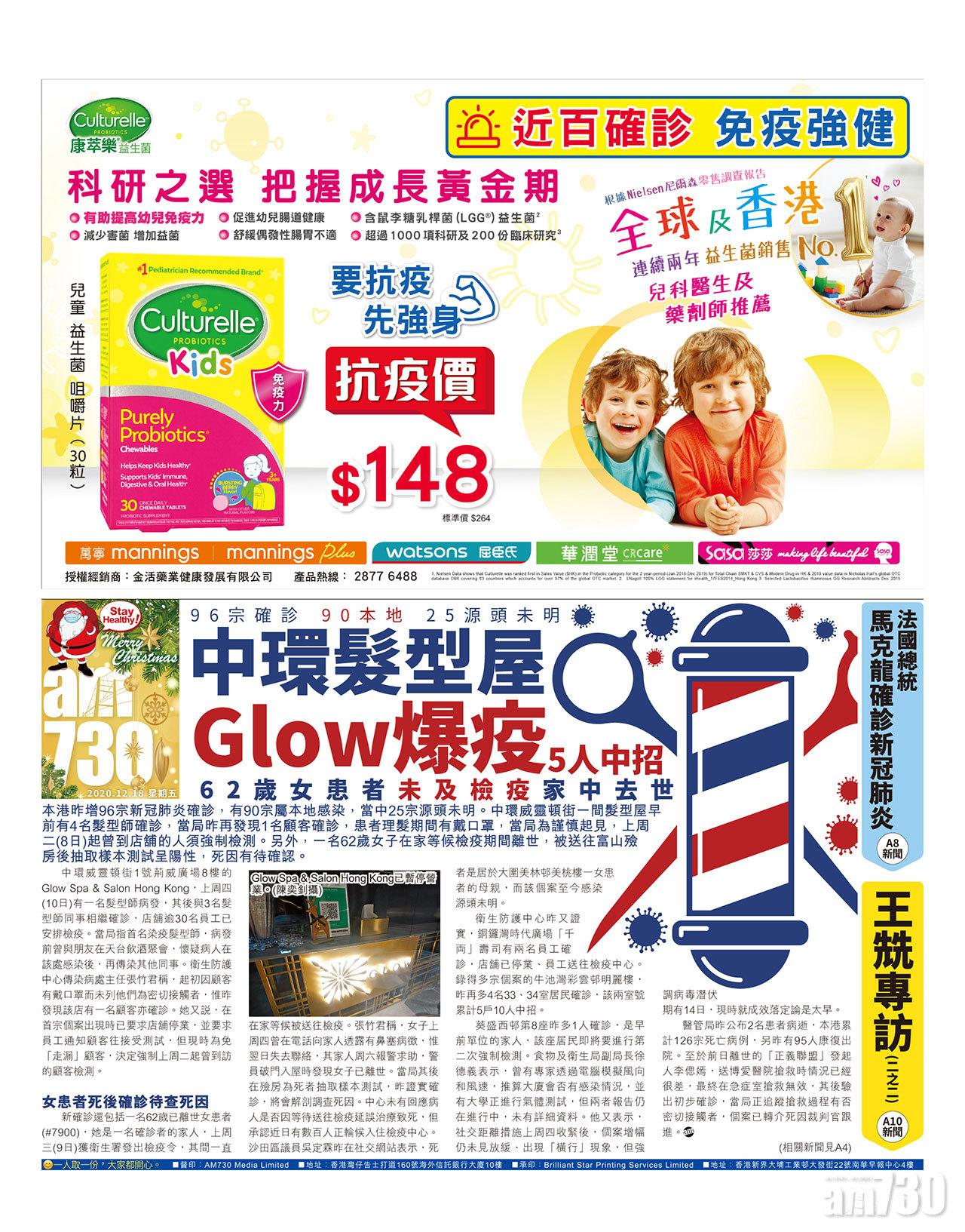 本港昨增96宗新冠肺炎確診,有90宗屬本地感染,當中25宗源頭未明。中環威靈頓街一間髮型屋早前有4名髮型師確診,當局昨再發現1名顧客確診,患者理髮期間有戴口罩,當局為謹慎起見,上周二(8日)起曾到店舖的人須強制檢測。另外,一名62歲女子在家等候檢疫期間離世,被送往富山殮房後抽取樣本測試呈陽性,死因有待確認。