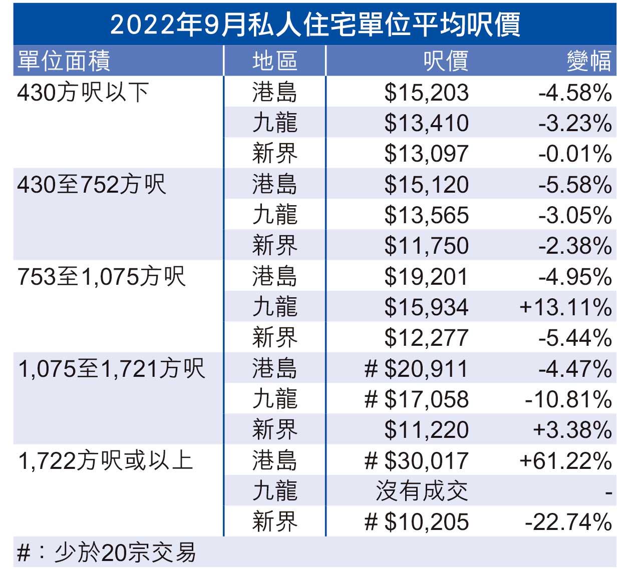樓價跌勢未止。差餉物業估價署昨公布,9月私人住宅單位售價指數為362.1,按月跌2.06%,創2019年1月以來新低,跌幅亦是2018年11月以來最大;今年首9個月樓價累跌8.07%。中原地產創辦人施永青形容樓價跌勢已形成,擔心會有負面連鎖反應,促請政府掌握樓市實況,作正確判斷。