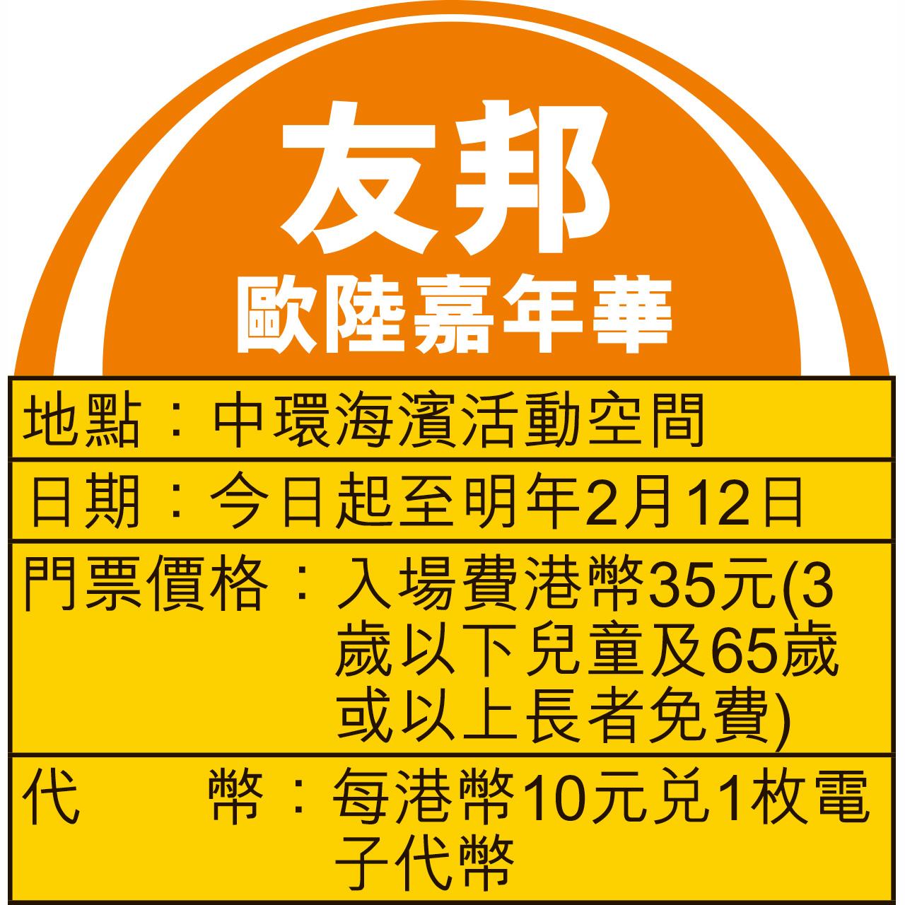 為期59天的友邦歐陸嘉年華今日開鑼,在中環海濱活動空間舉行。今年場內共有33款機動遊戲及34個攤位遊戲,當中3款機動遊戲首次在港亮相。截至昨日為止,已有17個機動遊戲獲機電署發牌,大會冀今日有30個機動遊戲開放。此外,今年嘉年華增設以不同電影和卡通為主題的3D奇幻館和3D立體彩燈園區,大會料整個活動吸引120萬入場人次。