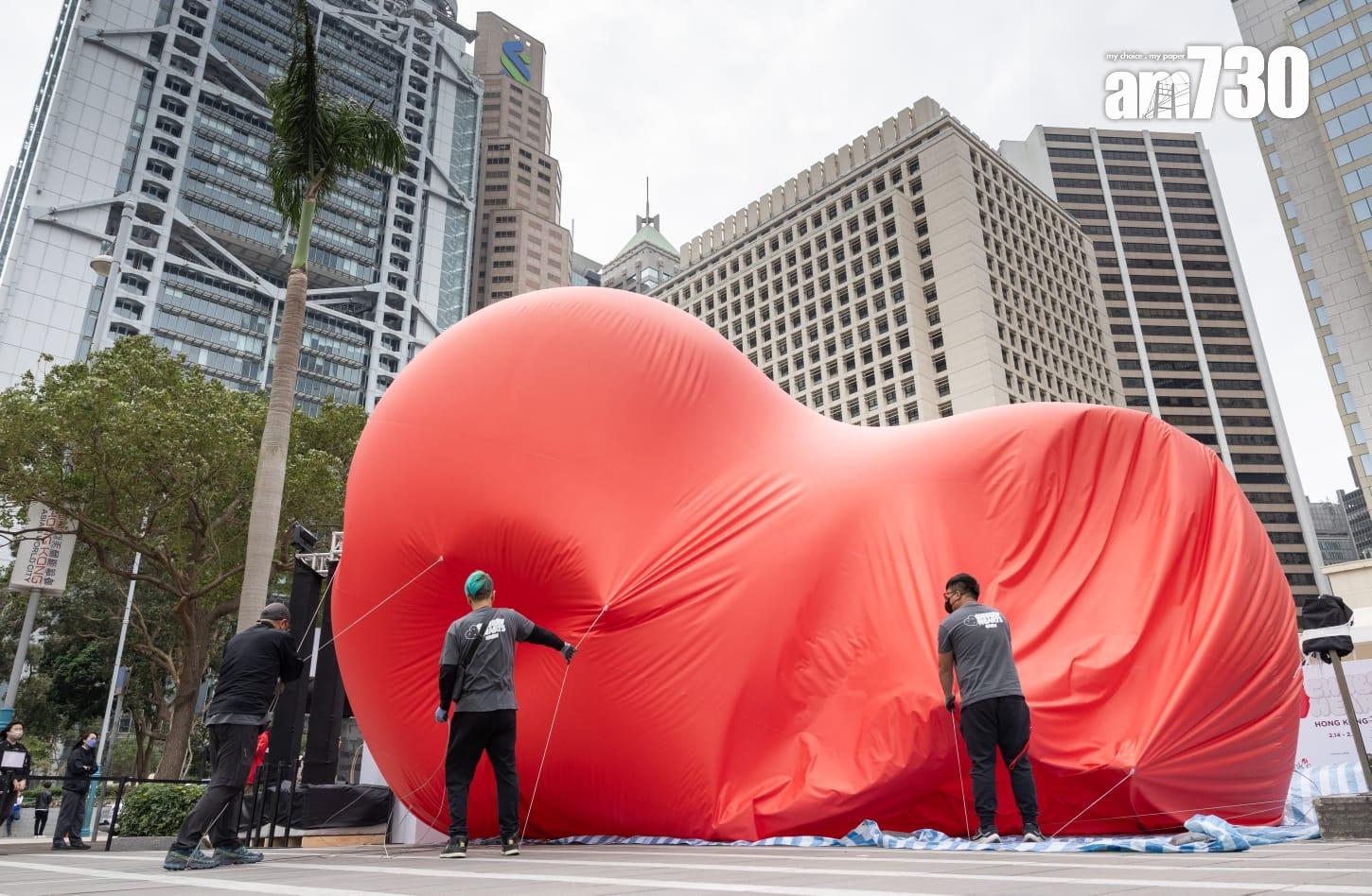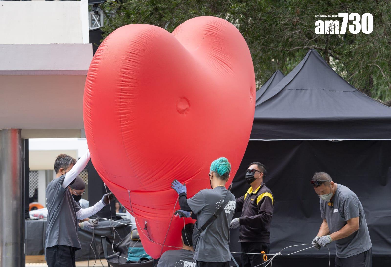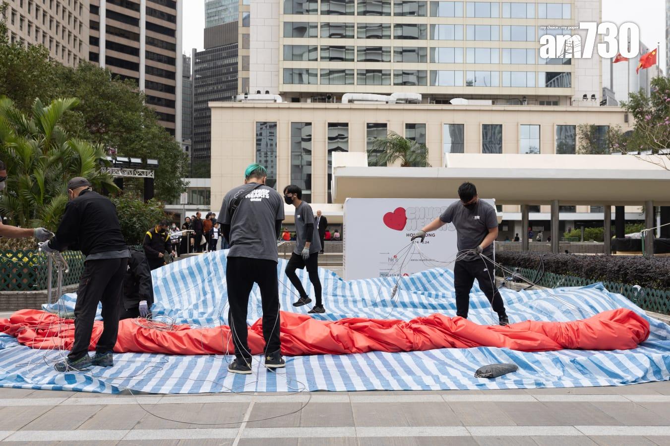 因應今日(2月17日)風勢,為確保公眾安全,原定於中環皇后像廣場花園展出的12米直徑紅心需暫時收起,改為首次展出兩個3米直徑紅心,展出時間為下午2時至晚上9時。