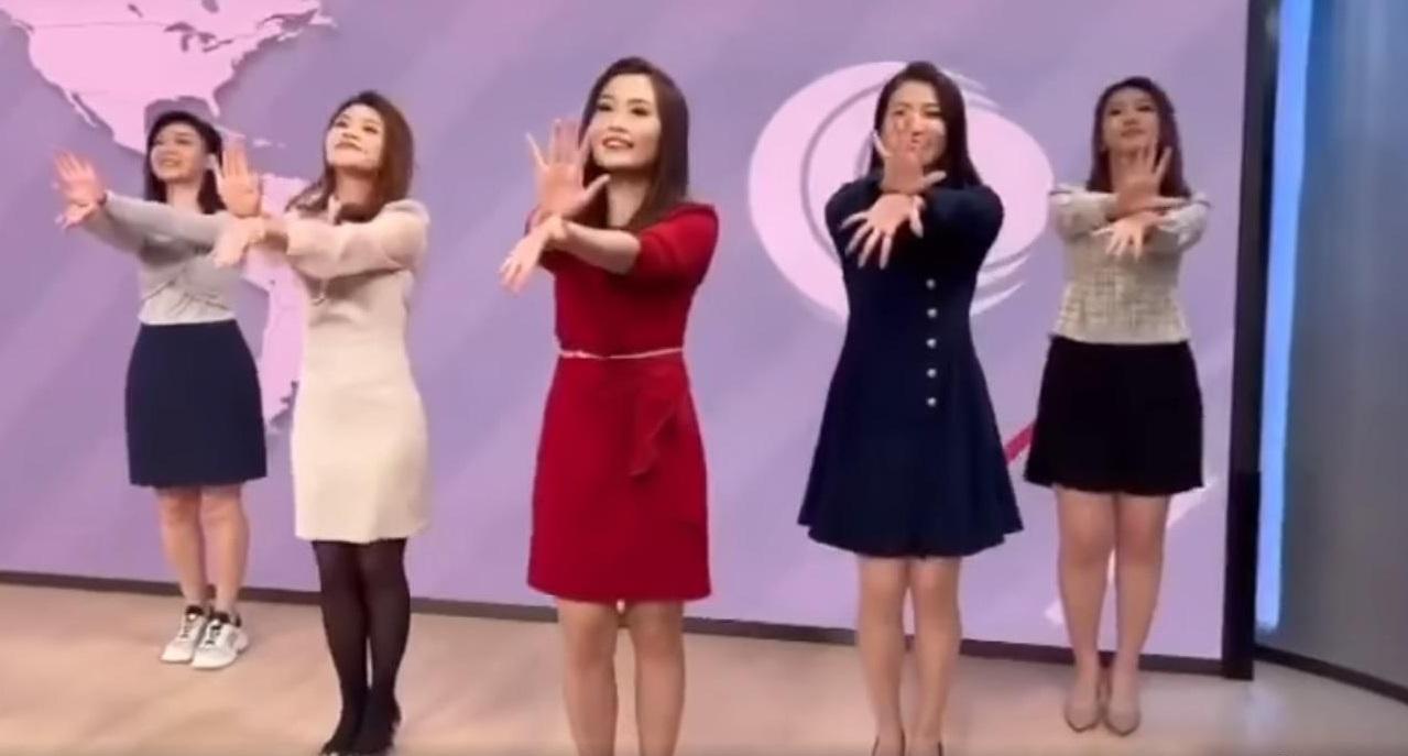 左起郭希琳、余茵娜、梁思齊、陳凱筠與羅添盈5位有線女主播於新聞部跳「開花舞」。