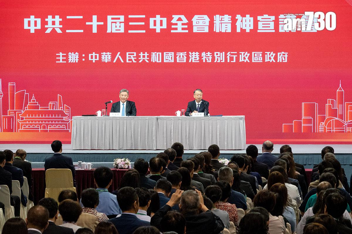 港府下午在灣仔會展舉行公開的三中全會精神宣講會,歷時約兩個半小時,沈春耀和王文濤共發言約100分鐘,然後再進行問答環節。沈春耀會上表示,感受到香港各界十分關注三中全會精神,顯示香港關注國家發展、期望發揮香港當中的地位,形容深受鼓舞、充分反映香港同胞的愛國愛港情懷。他續稱,三中全會主題提到的「推進中國式現代化」,需要靠改革開放推動,而改革開放是大踏步趕上時代前進步伐的重要法寶。