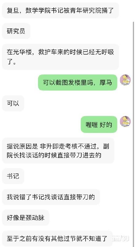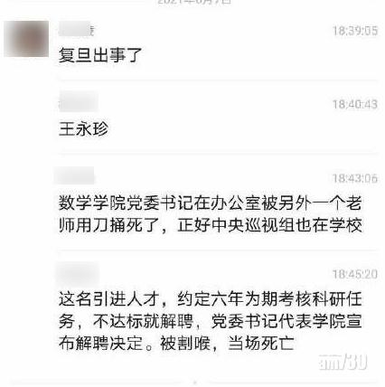 復旦大學2007年起試行「非升即走」人事聘用制度,若未能通過考核晉升,必須內部調職或不再續聘。傳言指,姜男正是以「非升即走」模式聘用,「可是脾氣不好,大約慢慢也就上不了課了,這幾年愈來愈惡化,院裡不續聘了」,王書記代表學院宣布解聘決定,「他(姜男)估計也有心理準備吧,所以用了這麼極端的方式」,將王書記割喉殺害,「據說現場像殺豬」。有報道則指,校方因姜男「科研不達標」而將其解聘。還有自稱曾與姜男一同應聘大學教職的網民表示,當時姜男自稱未能通過復旦大學的考核,只能與剛畢業的博士生/博士後一起競爭新教職。