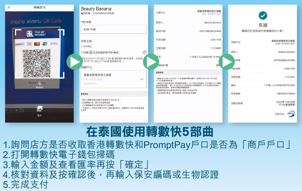 去旅遊最煩兌換外幣,換得少不夠用,換多了又不知如何處置,尤其是「碎銀」。轉數快及泰國的PromptPay合作,下周一(4日)起實施兩地快速支付系統互聯,港人以後可於當地商舖透過轉數快,以港元兌換泰銖消費。金管局提醒用戶,可能需要將應用程式更新至最新版本,每個戶口設每日一萬港元上限;市民在小店購物時應詢問該店的帳號類型,支付系統不支援個人戶口。