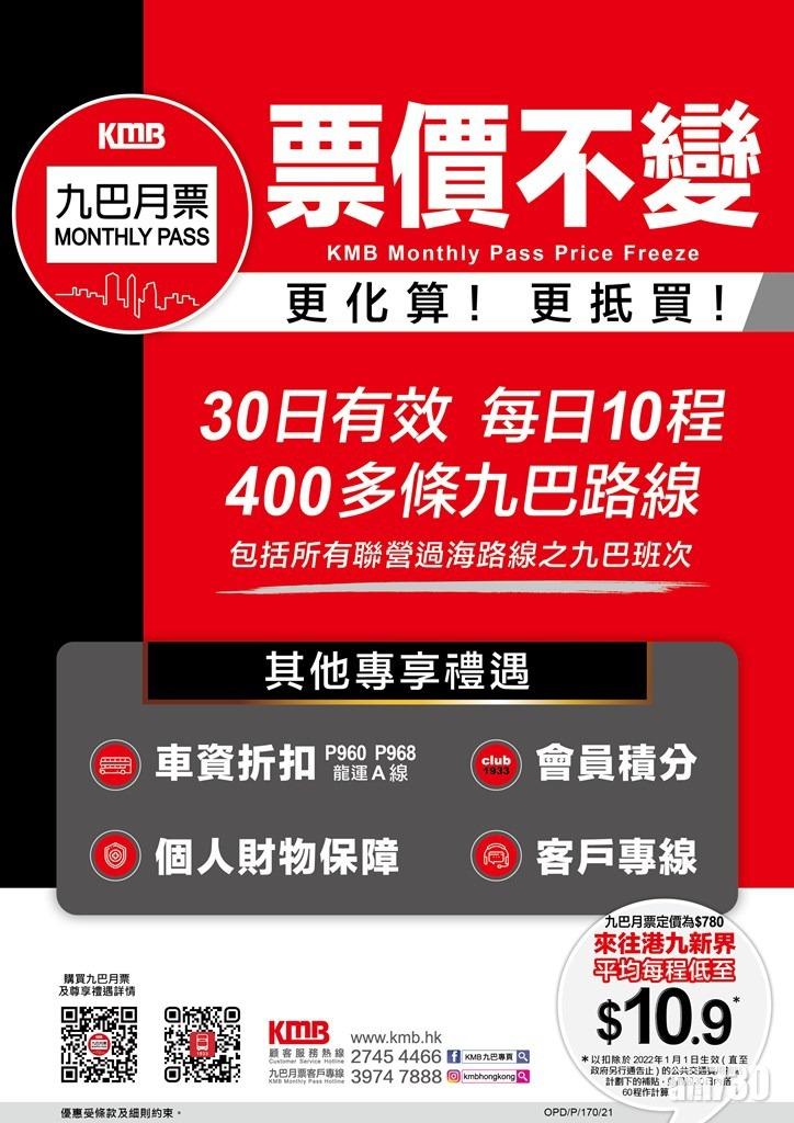 九巴表示,月票乘客可享其他專屬禮遇,包括以換取九巴口罩及其他精美禮品、享有巴士乘客微保險「BUS RYDE」保障,及以「升級體驗價」享受龍運A線機場巴士、P960及P968線服務。新收費表可參閱九巴網站。